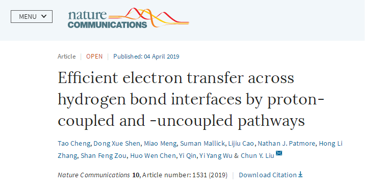 最近,英国威廉希尔唯一官网刘春元教授课题组在Nature子刊Nature Communications(IF:12.353)上发表了题为“Efficient electron transfer across hydrogen bond interfaces by proton-coupled and -uncoupled pathways”的原创性研究论文,我校为第一完成单位,刘春元教授为唯一通讯作者。