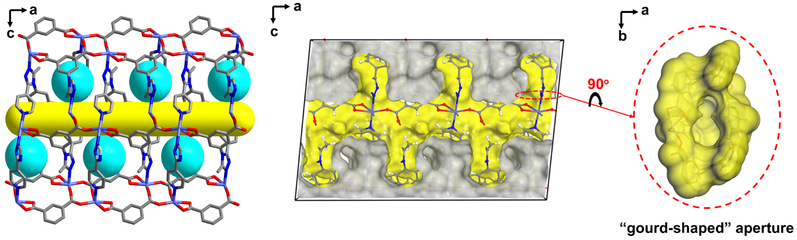 金属-有机框架材料(Metal-Organic Framework,MOF)是一类新兴的由金属节点和有机配体通过自组装形成的具有确定组成与结构的晶态多孔材料。和传统的多孔材料(分子筛、活性碳等)相比,前者凭借其可设计剪裁的框架和丰富多样的孔道结构吸引了科研工作者的广泛兴趣。威廉希尔官网广东省功能配位超分子材料及应用重点实验室陆伟刚、李丹教授研究团队针对MOF材料,首次提出正交阵列动态筛分机制,成功构筑了一例基于该分离机制的框架材料(命名为JNU-3)。该材料拥有三维网格结构,沿着晶体学a轴是4.5 × 5.3 Å的一维通道,在一维通道两侧是排列整齐的分子口袋,分子口袋和一维通道通过一个约3.7 Å的动态“葫芦形”窗口相连。气体可以在一维通道中快速扩散,而分子口袋则通过“葫芦形”窗口选择性地捕获丙烯分子,从而获得迄今为止最佳的丙烯/丙烷分离效果。研究人员通过原位单晶衍射和计算模拟解析了丙烯和丙烷分子与JNU-3的相互作用的筛分机制和动态过程。