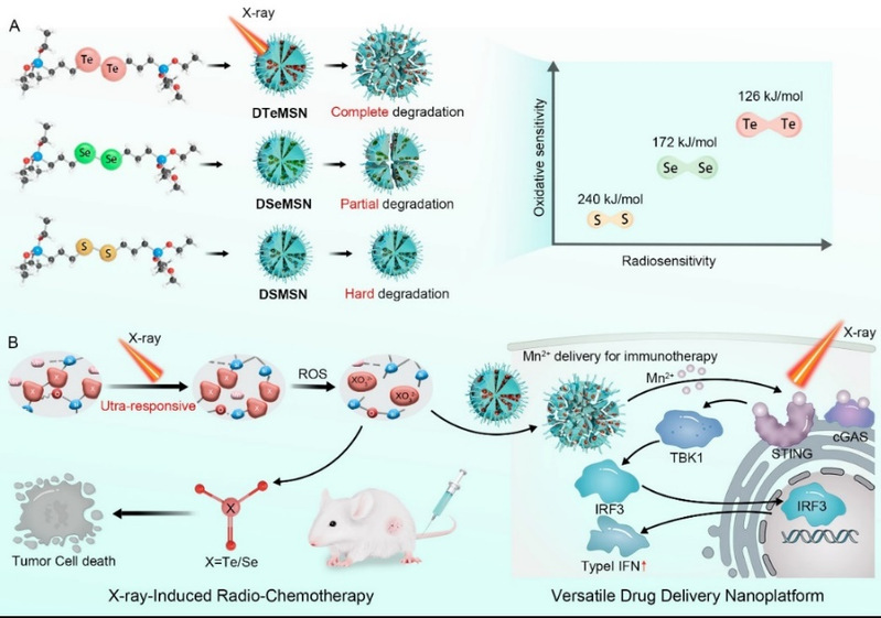 此外,我们将其作为药物载体负载二价锰离子(Mn2+,一种天然的干扰素基因(Sting)通路肿瘤免疫激活剂),构建出Mn-DSMSNs, Mn-DSeMSNs 和Mn-DTeMSNs,探索三种纳米载药体系中经过 X-ray 辐照后释放Mn2+并激活Sting通路的差异的异同,探索其在肿瘤放化疗协同免疫治疗方面的潜力。