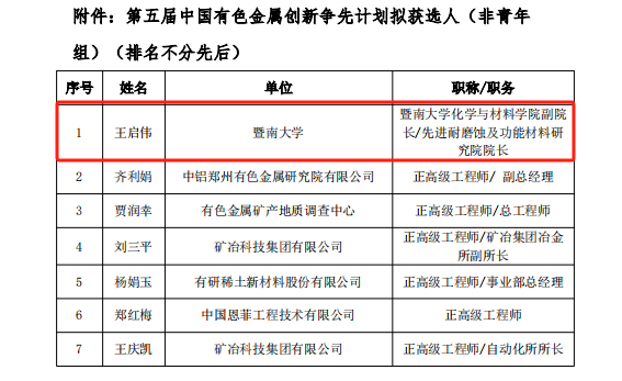 2024年10月,中国有色金属学会发布了《关于中国有色金属学会2024年度非青年类人才计划拟获选人的公示》,为奖励在有色金属领域得到公认的优秀科技工作者,中国有色金属学会设置了中国有色金属创新争先计划、中国有色金属学会杰出工程师计划,以激励有色金属领域科技工作者。经评审委员会评审,英国威廉希尔唯一官网王启伟研究员获批中国有色金属学会2024年度创新争先人才计划。