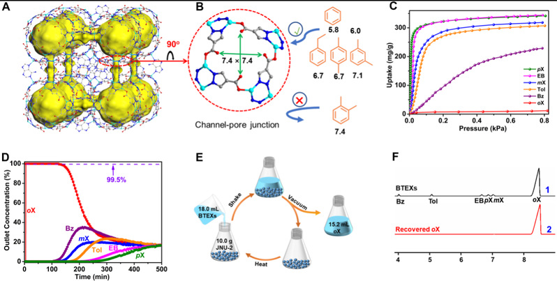 图2.(A)JNU-2通道-孔互连的3D网络结构以及康诺利表面示意图;(B)通道-孔连接处开口的特写视图,突出显示对角线的孔径以及BTEXs分子动力学直径;(C)在353K条件下,pX、EB、mX、Tol、Bz和oX在JNU-2上的单组分蒸气吸附等温线;(D)pX/EB/mX/Tol/Bz/oX(1/1/1/1/1/1)混合物在JNU-2上的穿透曲线;(E)将JNU-2浸泡在pX/EB/mX/Tol/Bz/oX(2/2/2/2/2/90)的BTEXs混合物中的操作示意图;(F)初始BTEXs和回收的oX的GC分析;