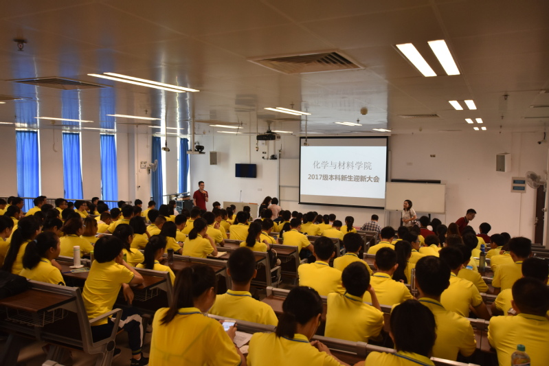 9月11日是暨大新生训练营的第二天,刚进行完武术队列训练的2017级化材本科新生,一早就坐满了教学楼N414教室,期待着一场精神洗礼——学院迎新大会。