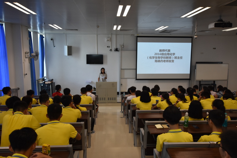 随后,第四届本科教学校长奖新任教师教学竞赛特等奖获得者、2016级应用化学(化学生物学创新班)班主任陈晓丹老师上台发言,她叮嘱新同学们要珍惜青春,敢于尝试,学会选择,善于自省,提高行动力,才能拥有完美的大学生活。