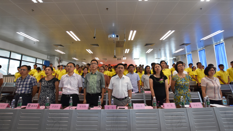 8点30分,在嘹亮的国歌声中大会正式开始,出席大会的有学院院长李丹教授,学院党委邵桂珍副书记(主持工作),副院长李红教授、陈填烽教授,办公室主任黄建新,化学系主任李毅群教授、党总支书记查海燕老师,材料科学与工程系党总支书记容建华教授,以及新生各班班主任、教师代表和辅导员。大会由邵桂珍书记主持。