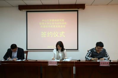 2018年1月22日下午,威廉希尔官网与中山大学惠州研究院合作签约仪式暨双边合作发展研讨会在惠州召开,双方共建“校外教育实践基地”,并与深圳市尤佳环境科技有限公司、惠州市华泓新材料股份有限公司、惠州东方雨虹建筑材料有限责任公司、广东恒达胶管制品有限公司、惠州晟荣生物科技有限公司、惠州绿亚生物材料有限公司、惠州笃行纳米材料有限公司、惠州哈克森润滑油材料有限公司等8家企业签订人才培养合作协议。威廉希尔官网院长李丹,党委书记邵桂珍,副院长李红、陈填烽,校实验室与设备管理处处长徐石海,中山大学惠州研究院院长助理吴海波、陈宇,产学研办主管李启灵,人力资源部主管林泽灏及企业代表等参加了签约仪式。