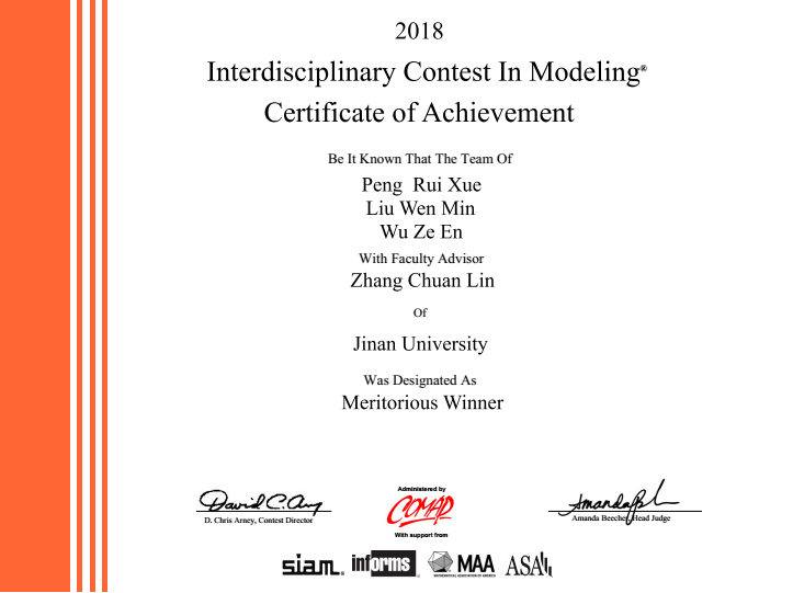 美国大学生数学建模竞赛(MCM/ICM)是由美国数学及其应用联合会主办,是唯一的国际性数学建模竞赛,也是世界范围内最具影响力的数学建模竞赛。赛题内容涉及经济、管理、环境、资源、生态、医学、安全、未来科技等众多领域。竞赛要求三人(本科生)为一组,在四天时间内,就指定的问题完成从建立模型、求解、验证到论文撰写的全部工作,体现了参赛选手研究问题、解决方案的能力及团队合作精神。