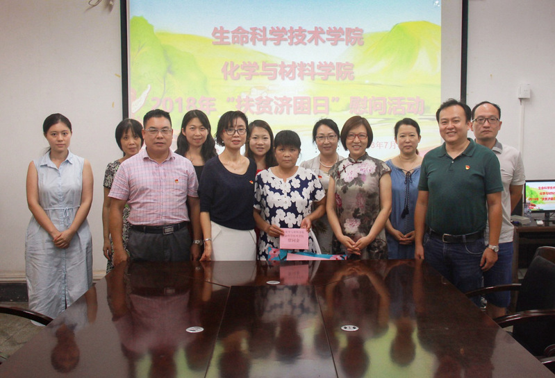 2018年7月4日下午,英国威廉希尔唯一官网党委和生命科学技术学院党委在生科院会议室举行“扶贫济困日”慰问活动,对扶贫对象——来自广东南雄市水口镇篛过村帮扶户刘景英进行了慰问。化材院党委书记邵桂珍、生科院党委李弘剑书记和生科院党委代表参加了活动。
