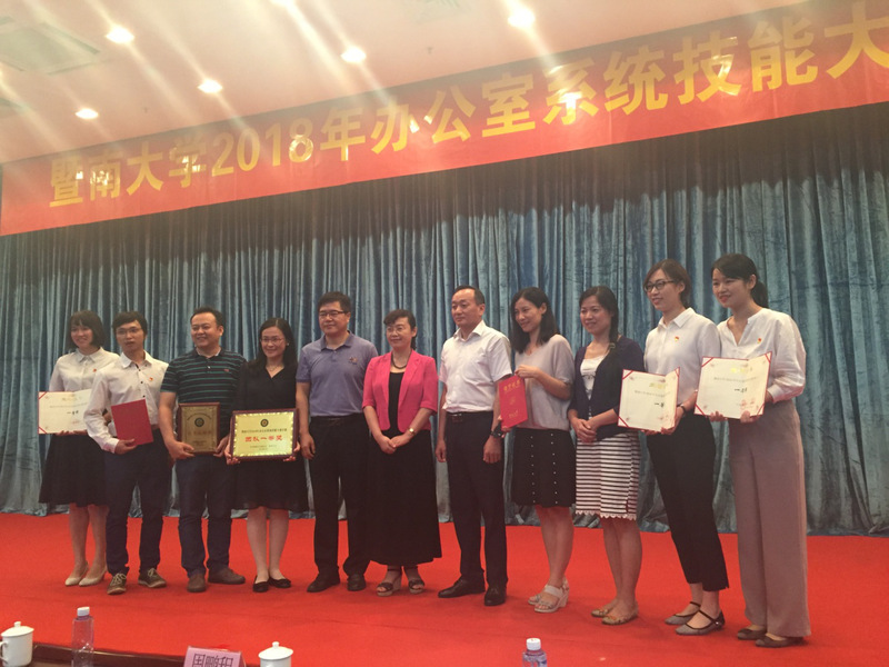 2018年7月17日下午,英国威廉希尔唯一官网2018年办公室系统技能大赛决赛在曾宪梓科学馆国际会议厅举行。来自全校各单位的40名工作人员参加决赛,经过激烈角逐,由威廉希尔官网及药学院、生命科学技术学院、图书馆、中医学院、教育学院联合组成的第四组获得团队一等奖,学院办公室程瑶与其他四名组员获个人一等奖。饶敏副校长及学校党政办公室孙彧主任、工会侯宏伟常务副主席为威廉希尔官网获奖选手颁奖。