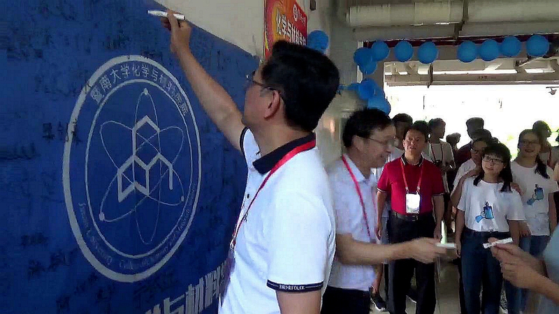 图1.校党委林如鹏书记在化材院院会大旗上签名