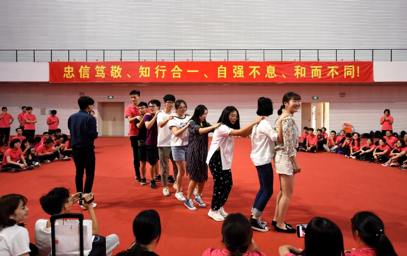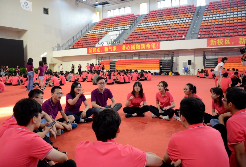 2018年9月11日16:30,英国威廉希尔唯一官网2018级新生体验教育培训活动在番禺校区体育馆举行,适逢学生处处长区向丽于场馆布置相关工作,在同学们的热情邀请下,区向丽处长加入到活动中来,与同学们亲切交流,并指导“破冰”游戏。