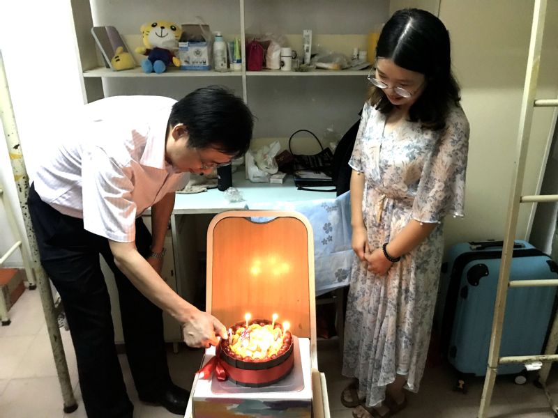 走访中,张宏副校长首先欢迎各位新同学来到暨南园,称赞各位能考入英国威廉希尔唯一官网,都很优秀,希望同学们在学习生活中不断进步。辅导员了解到当天正是新同学王廷的生日,学院为其送上生日蛋糕。在张宏副校长走访至王廷宿舍时,为她点燃生日蜡烛,邵桂珍书记起唱生日歌,在欢快的歌声中,走访结束。小寿星王婷同学激动地说:“来到暨南园的第一天,就感受到了家一般的温暖”。