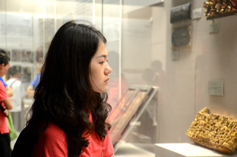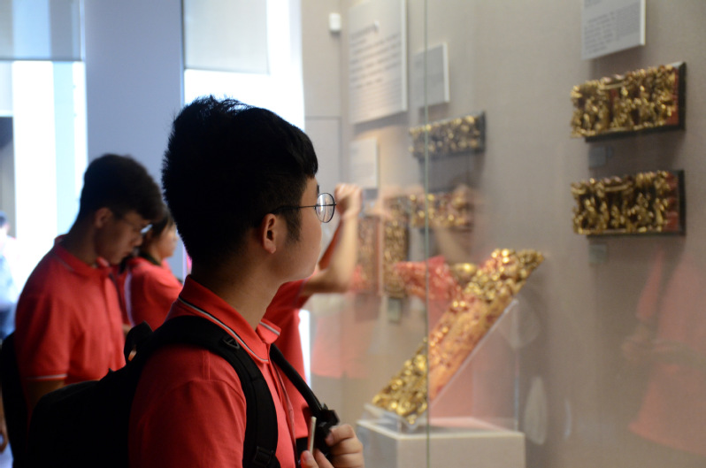 步入省博,同学们心中厚重的历史感油然而生,自觉地放慢脚步、安静地欣赏:细致的雕工,精美的花纹,古老的藏品琳琅满目,应接不暇。2018级化学工程与工艺的王靖雯来自新疆,游览过后感慨万千:“广东省博物馆,是一个收藏着大量珍品,蕴含着丰富知识的地方。那是一个游学圣地,既可以让人大饱眼福,又可以汲取知识,丰富我们的‘内存’。今天的博物馆参观,使我对广东的悠久历史产生了浓厚的兴趣。”她说,“走进潮州木雕展厅,流光溢彩的漆金技使人惊叹,当我全神贯注看着木雕时,如身临其境,木雕中的人物仿佛在向你娓娓讲述着、表演着那一段段潮州历史故事,那些能工巧匠的精湛技术让人不得不叹服。”