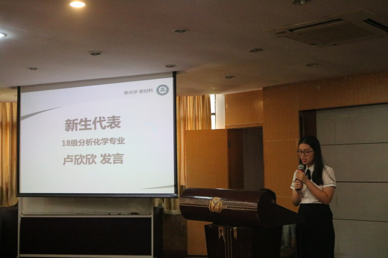在庄严的国际歌播放结束之后,李丹院长致辞。李丹满怀激情地向同学们介绍,学院自成立以来发展迅速、成绩喜人,化学学科与材料两个学科均位列ESI全球排名前1%,占全校8个排名前1%的学科之2,学院的化学一级学科博士点也于今年获批,在2018级博士毕业前,学院将建好博士后流动站,为同学们提供学业发展“一条龙服务”。随后李院长对同学们提出了两点寄语,希望同学们能够快速融入研究生的学习与生活,找到自己的奋斗目标,并为之付出努力;希望各位同学能够爱上化学和材料专业,同时欢迎大家在研究生毕业后留校继续深造。