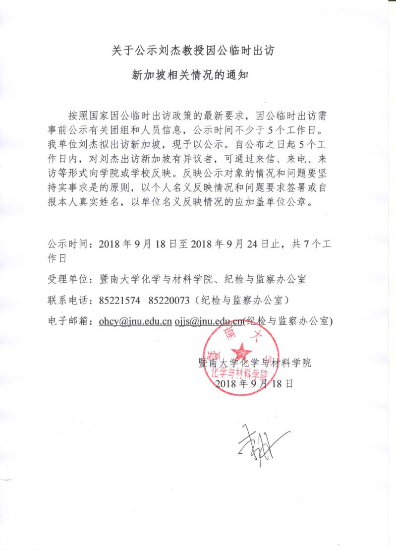 关于公示刘杰教授因公临时出访新加坡相关情况的通知
