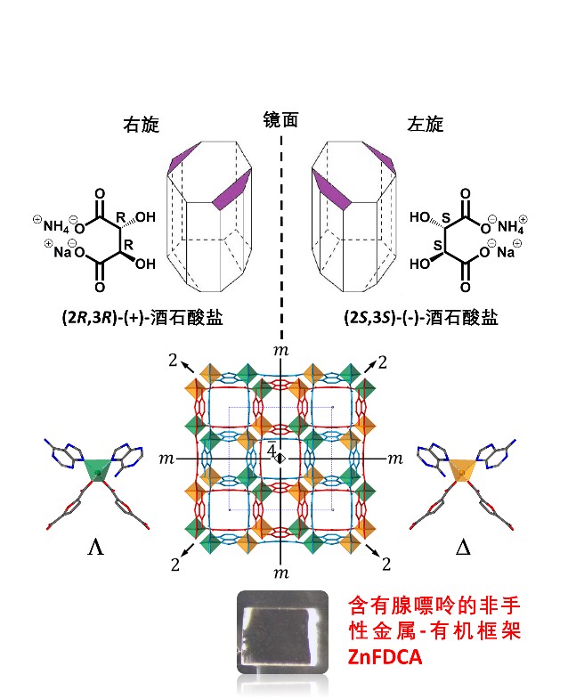 在研究中,李丹教授团队研究人员发现:一例新制备的腺嘌呤基生物金属-有机框架材料(简称ZnFDCA,见上图下半部分)为含有对称面没有对称中心的非手性结构,但却具有光学活性。ZnFDCA是由腺嘌呤、2, 5-呋喃二甲酸和硝酸锌等非手性组分组装而成。该晶体是二维层状结构,结晶于非手性晶体学点群