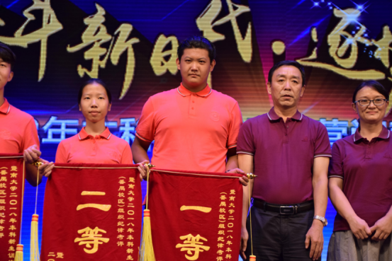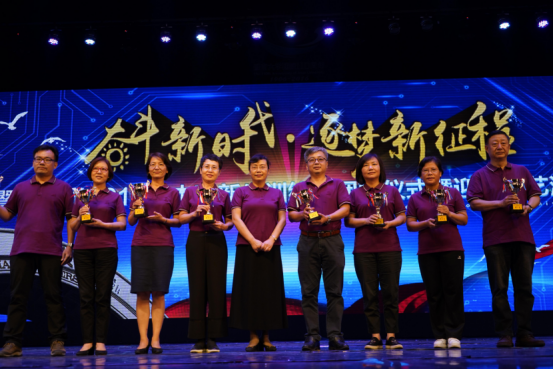 邵桂珍书记(中)带领化材学子在本部礼堂领奖合照