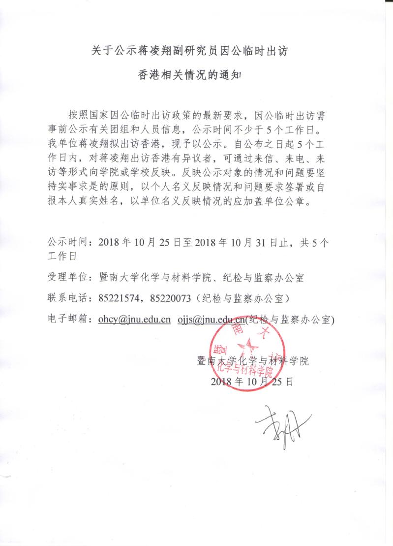关于公示蒋凌翔副研究员因公临时出访香港相关情况的通知