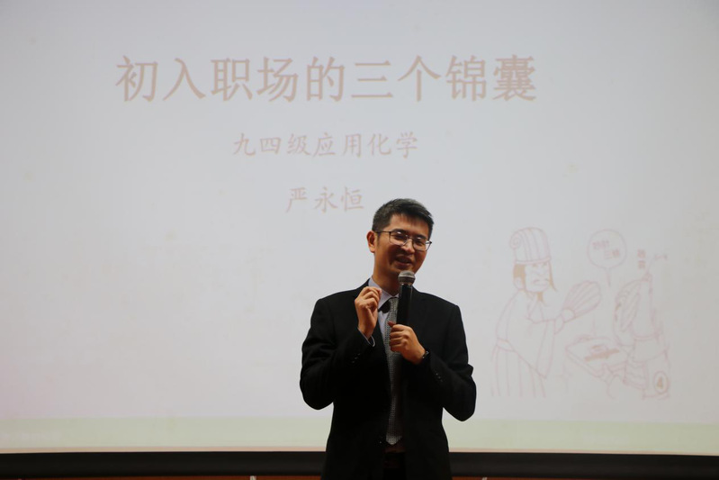 最后一位分享干货的师兄是94级校友严永恒先生。严师兄毕业以后先后在国企和港资企业从事销售工作,后转至全球最大的不干胶企业,从基层销售员一直做到大区销售总监,之后创立自己的标签材料公司,现在依然在各个方面不断创新发展。严师兄同样为我们带来了初入职场的经验分享。他满怀激情地分享了“初入职场的三个锦囊——理想和信仰,坚持,包容和开放的心态”。最后,师兄激励我们,“你的心胸有多宽广,你的事业就有多伟大”!