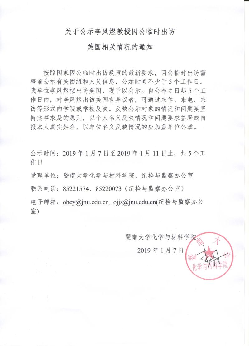 关于公示李风煜教授因公临时出访美国相关情况的通知