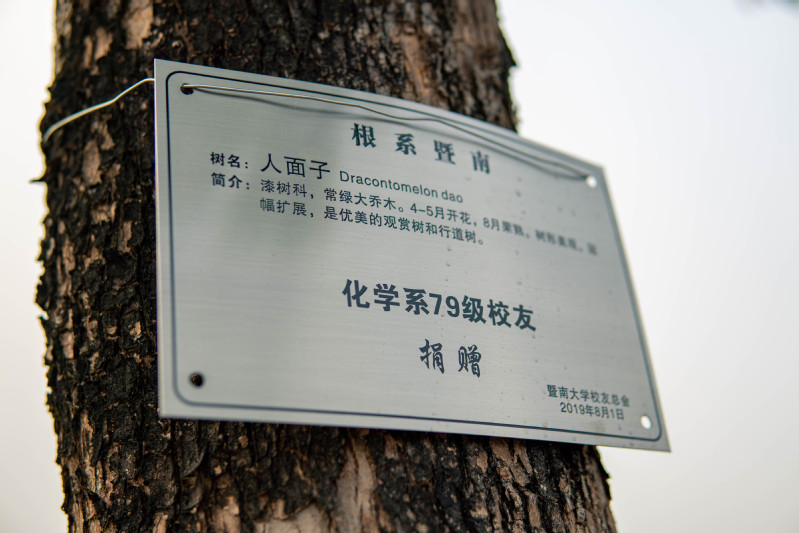 最后,校友们来到本班捐赠的树木种植点。看着铭牌上“化学系79级校友捐赠”的字样,校友们非常开心,纷纷拍照留念。这是他们与母校新的牵挂,并将伴随着新校区、新院楼共同成长。
