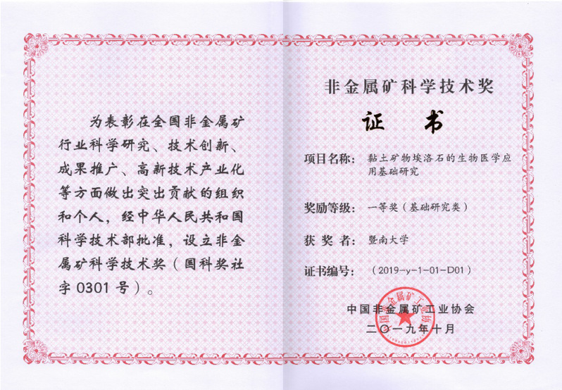10月28日,中国非金属矿工业大会在广州举行。会上,中国非金属矿工业协会颁发了2019年度中国非金属矿科学技术奖,威廉希尔官网刘明贤教授、周长忍教授联合药学院何蓉蓉教授共同申报的“黏土矿物埃洛石的生物医学应用基础研究”获得基础研究类一等奖。这是我校首次获得该项奖励,也是今年非矿科技奖基础研究类的唯一一个一等奖项目。