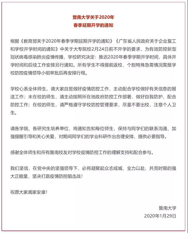 大家好!目前广东省已启动突发公共卫生事件一级响应机制,把疫情防控作为当前压倒一切的重要政治任务。为有效防控新型冠状病毒感染肺炎疫情传播,根据《教育部关于2020年春季学期延期开学的通知》《广东省人民政府关于企业复工和学校开学时间的通知》,学校1月29日发布的《英国威廉希尔唯一官网关于2020年春季延期开学的通知》,通知要求所有学生不得在2月24日前提前返校,个别特殊急需情况需经学院同意报学校防控疫情领导小组审批后再安排行程;任何单位和个人不得批准学生提前返校;已离校的教职工建议不要急于返校,安心在家中进行科研工作;具体返校时间均以学校后续通知为准。