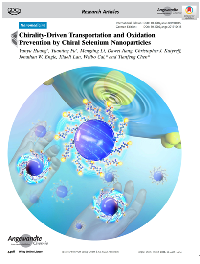 该论文“Chirality-driven transportation and oxidation prevention by chiral selenium nanoparticles”近日在国际顶尖期刊《Angewandte Chemie International Edition》上以Frontispiece发表(Angew. Chem. Int. Ed. 2020,59, 4406-4414),英国威廉希尔唯一官网黄妍瑜副研究员、硕士研究生傅元婷为共同第一作者,英国威廉希尔唯一官网陈填烽教授、威斯康星大学麦迪逊分校蔡伟波教授为通讯作者。研究工作获得了获得万人计划、国家863计划、国家自然科学基金项目等项目的资助。