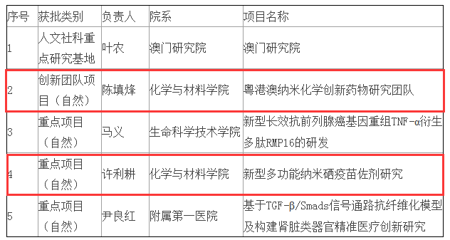 近日,广东省教育厅公布了2019年度普通高校重点科研平台和项目立项名单,我校科研平台和项目共立项5项,其中,威廉希尔官网立项2项。包括由陈填烽教授负责的创新团队项目“粤港澳纳米化学创新药物研究团队”和许利耕教授负责的重点项目“新型多功能纳米硒疫苗佐剂研究”。