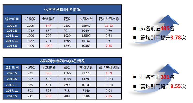 图1. 化学学科、材料科学学科近5年ESI排名情况