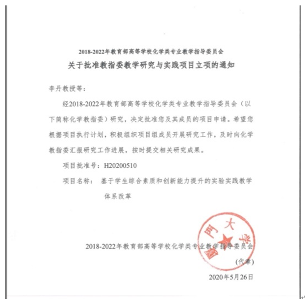 5月26日,教育部高等学校化学类专业教学指导委员会公布了2020年度专业教育教学改革研究课题,威廉希尔官网李丹教授主持的“基于学生综合素质和创新能力提升的实验实践教学体系改革”项目获得立项。这是威廉希尔官网首次获批的国家级教改项目,也是化学类专业国家级教改项目零的突破。