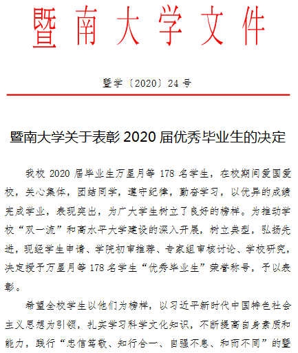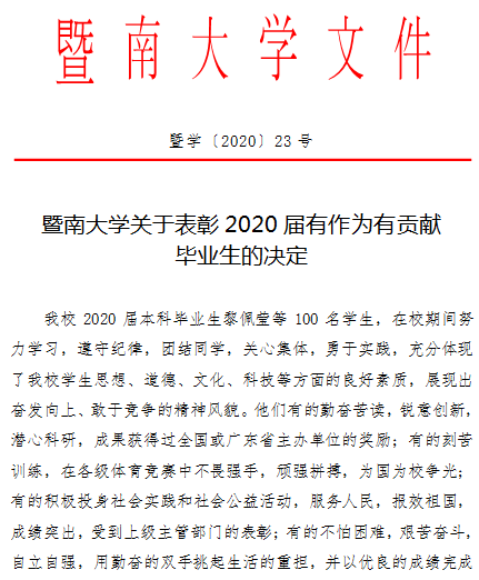 获奖情况:美国大学生数学建模公开赛国际级一等奖(国际)、国家奖学金(国家级)、广东省材料创新大赛二等奖(省级)、南风窗调研大赛全国百强(国家级)、英国威廉希尔唯一官网“暨南好班长”标兵奖、“进取之星”标兵奖、“暨南之星”提名奖(校级)、“科顺·常春藤”“优秀学生一等”、“优秀学生干部”、毕业生“优秀学生干部”奖学金、“优秀学生干部” “优秀学生”“优秀共青团员”“优秀班长”、新生训练营“优秀学生干部”、“优秀营员”、“优秀兼职辅导员”荣誉称号、概论课展示大赛校级三等奖(校级)、英国威廉希尔唯一官网“双有”毕业生(校级)