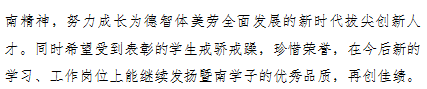 获奖情况:2017年国家励志奖学金(国家级);2018年国家励志奖学金(国家级);2019年国家励志奖学金(国家级);优秀班长荣誉称号(校级)