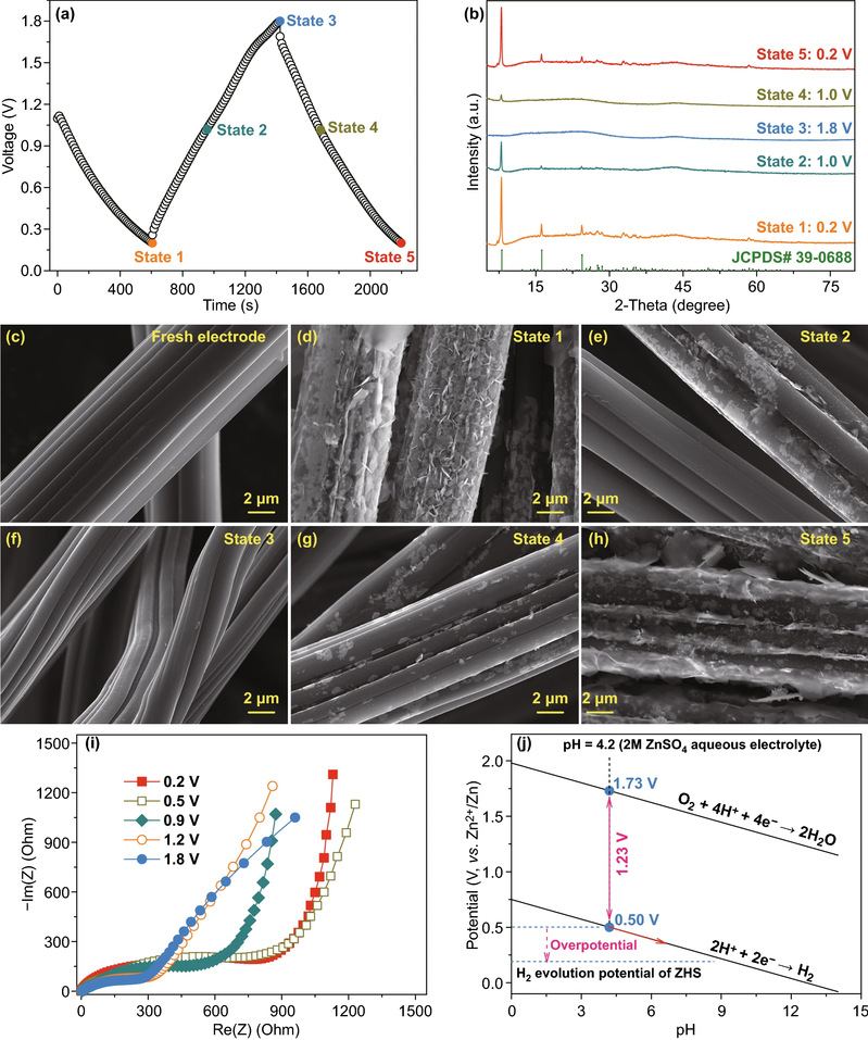 图2、层次孔碳纤维正极储能机理研究:(a)充放电曲线及对应不同电压下的(b)XRD图、(c-h)微观形貌图和(i)交流阻抗图谱。(j)水系锌离子混合电容器碳正极表面析氢析氧反应电位分析。