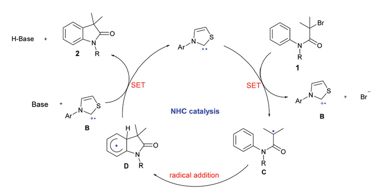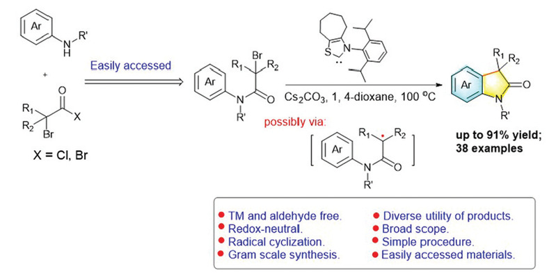 图1. 氮杂环卡宾催化经由单电子转移途径的吲哚酮合成