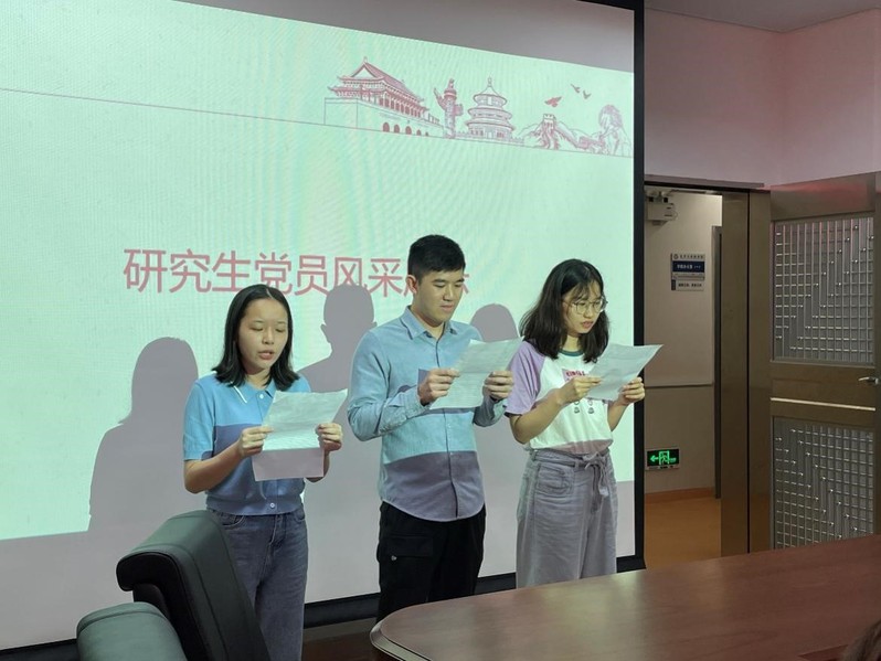 随后,研究生党员代表进行了风采展示,他们深情朗诵了《祖国颂》《中国梦》《可爱的中国》,“生存一天就要为中国呼喊一天”,“站直了我们就是世界的主人”。诗句掷地有声,令人鼓舞。