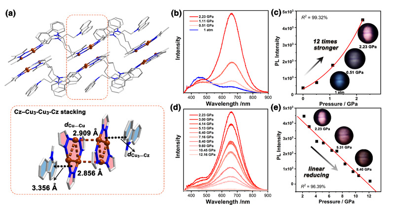 图2. 具有罕见压致磷光增强的1a配合物的晶体结构,分子间咔唑–环三核堆积示意(a); 1a在外压下的发光光谱:(b) 1 atm – 2.23 GPa, (d) 2.23 GPa – 12.16 GPa; 1a的发光强度与外压的关系及发光照片(c), (e)。