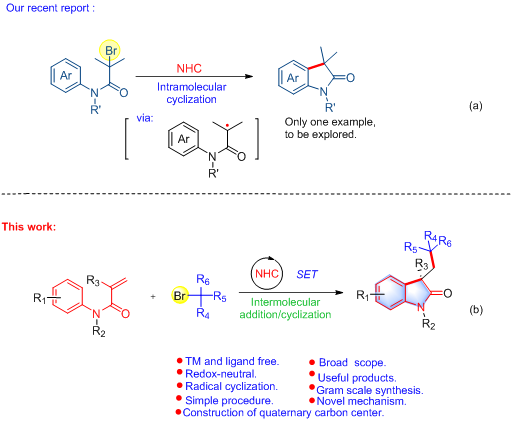 近期,王成明教授课题组刚刚报道了第一例NHC-催化无醛类底物参与的a-溴代芳基酰胺的分子内自由基环合反应(图1,a),在很大程度上拓宽了N-杂环卡宾的化学(Org. Chem. Front. 2021, 8, 1454–1460)。本文是在上述研究基础上,王成明教授课题组在这一领域的进一步深入研究。
