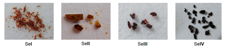 图1. [Fe(tpa)(NCSe)2]四种同质异形体的晶体相片。