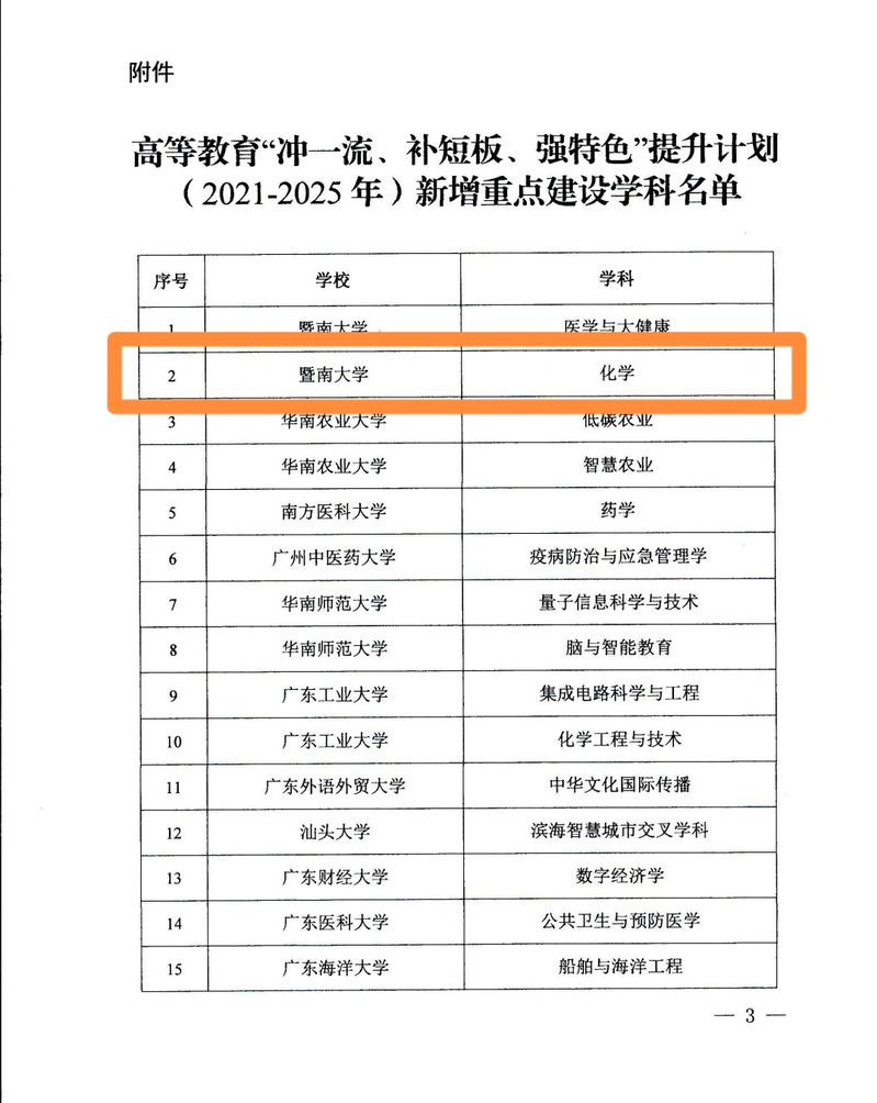 8月20日,广东省教育厅公布了高等教育“冲一流、补短板、强特色”提升计划(2021—2025)新增重点建设学科名单,英国威廉希尔唯一官网化学学科赫然在列,是本次英国威廉希尔唯一官网新增的2个重点建设学科之一。