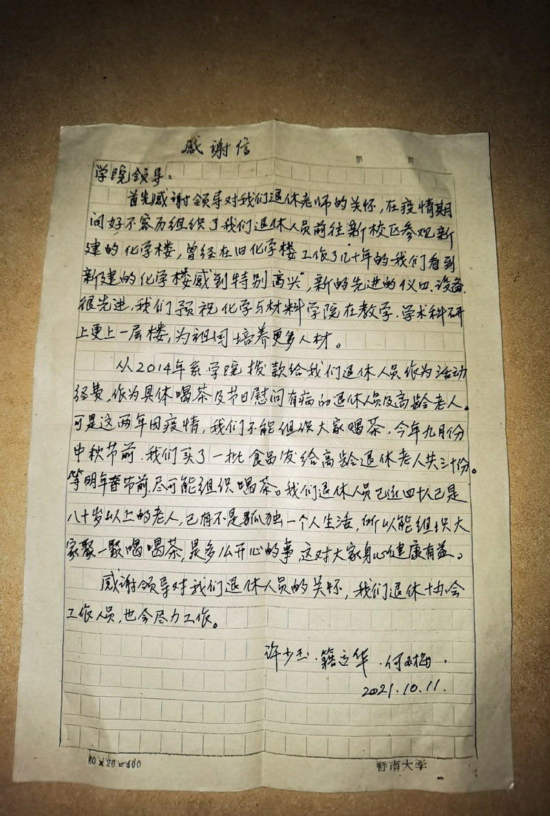 退休教职工协会成员许少玉、籍运华、何玉梅代表全体62名离退休教师,亲笔书写感谢信,真挚地感谢了学院领导对退休教师的关怀,让退休教师们感到了开心和温暖,同时预祝学院在教学和学术科研上更上一层楼,为祖国培养更多人才。