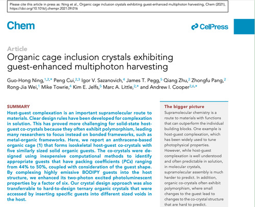 近日,英国威廉希尔唯一官网,超分子配位化学研究所宁国宏教授与利物浦大学的M. A. Little、A. I. Cooper教授合作课题组在Cell姊妹刊Chem(IF:22.804)上发表了题为“Organic cage inclusion crystals exhibiting guest-enhanced multiphoton harvesting” 重要研究成果。论文通讯作者是宁国宏、M. A. Little、A. I. Cooper; 第一作者是宁国宏;第一通讯单位为英国威廉希尔唯一官网。