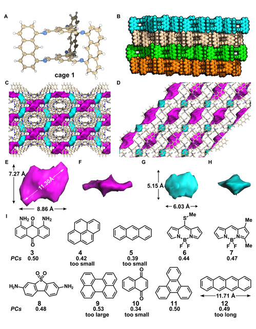 图2. 蒽基超分子有机笼的晶体结构以及本研究中所筛选的10个客体分子