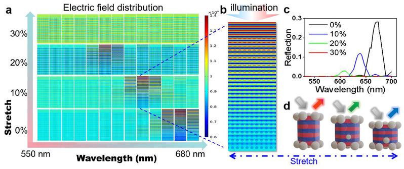 图2. 有限元分析(FEA):(a)光子晶体膜在不同波长光照射下拉伸过程中的电场分布的有限元分析;(b)在606 nm光照下,10%拉伸PC膜内的电场分布;(c)不同拉伸率PC膜的有限元模拟光谱;(d) 拉伸过程中PC膜的变形机制。