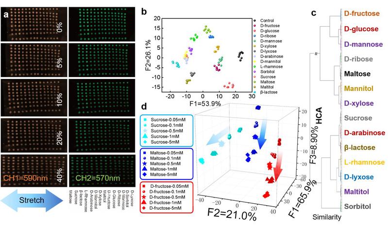 图4. 可拉伸PC芯片用于各种糖类的鉴别 (a) ARS-DPBA斑点PC芯片对14种糖类的荧光响应。拉伸率的变化引起荧光信号的多样性。 (b) 14种糖类的LDA鉴别结果。(c) 14种糖类的HCA分析的树状图; (d) 梯度浓度下三种糖的得分图,沿箭头方向浓度增大。