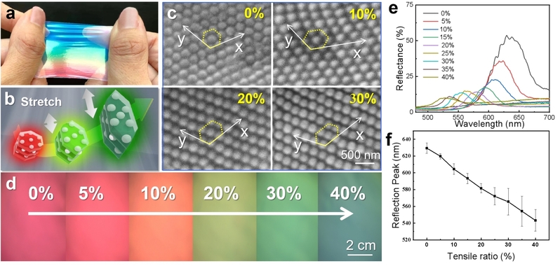 图1. 可拉伸光子晶体膜——结构色和弹性光学特性:(a)受力不均匀时柔性PC膜的多彩结构色;(b) 可拉伸PC膜的纳米结构-颜色对应示意图;(c)不同拉伸率(εx)下PC膜的SEM图;(d) εx从0到5%,10%,20%,30%,40%的PC膜在白光照射下的光学照片;(e) 拉伸过程中PC膜的反射光谱;(f) 不同拉伸率下光子晶体膜的反射峰位置。