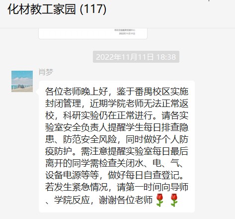 要务必落实主体责任,妥善安排行政人员、实验技术人员和老师驻守校区,加强教学督导巡课和课下阅读指导,确保线上指导科研、线上教学工作质量。向各位研究生导师发送温馨提示,强调要关心关爱学生,特别是对锦溪苑的学生,了解其学习生活动向,及时回应问题;加强学生线上指导和实验安全指引,保障校区内的实验安全;提醒学生不在实验室、办公室使用大功率电器或给电动车充电;对锦溪苑的学生要布置阅读文献、安排理论研讨等非实验工作任务;引导学生正确看待疫情防控形势,按要求参与核酸检测,坚持健康打卡,做好个人防护。