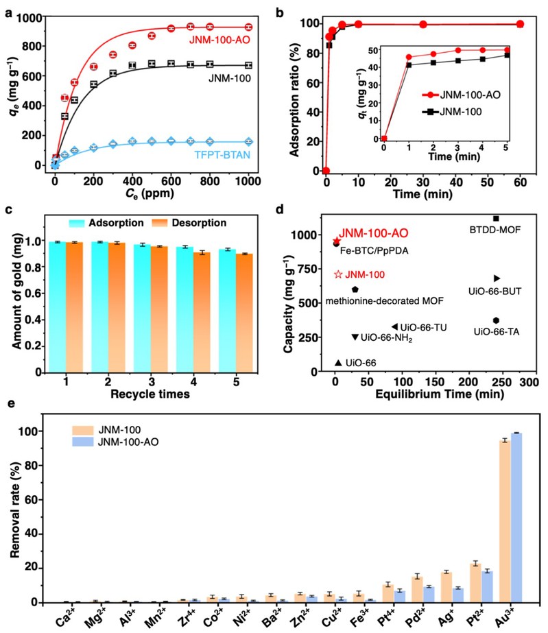 图3 (a) JNM-100-AO、JNM-100和TFPT-BTAN对金在5 ~ 1000ppm初始浓度范围内rt的吸附等温线。 (b) JNM-100和JNM-100- AO在初始浓度为50 mg L−1时吸附金的动力学曲线。 (c) JNM-100-AO对金的可循环吸附性能。 (d) MOF材料吸附金能力对比。 (e) JNM的选择性吸附性能。
