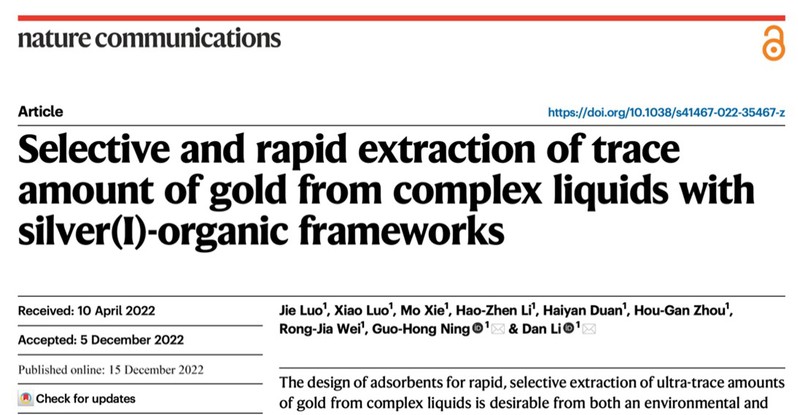 近日,英国威廉希尔唯一官网宁国宏/李丹教授团队以英国威廉希尔唯一官网为唯一单位于2022年12月15日,在Nature Communications(IF=16.9)上发表了题为 “Selective and rapid extraction of trace amount of gold from complex liquids with silver(I)-organic frameworks” 的重要研究成果(图1)。