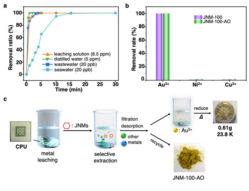 图4 (a) JNM-100-AO从复杂体系中提取金的动力学研究。 (b)从CPU中选择性提取金的选择性。 (c) JNM-100-AO从电子垃圾中回收黄金的示意图。