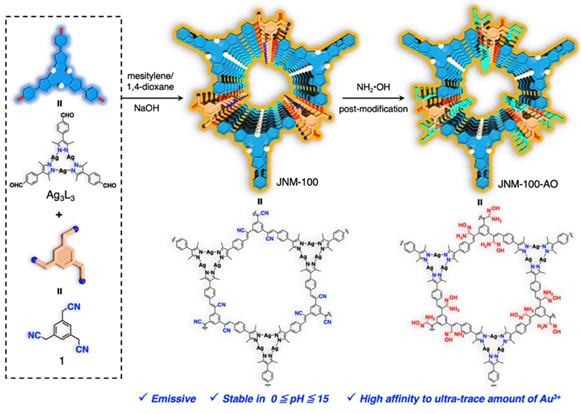研究团队一直致力于动态共价键链接的金属有框架材料的研究,在之前工作(CCS Chem. 2020, 2, 2045–2053;Chem. Sci. 2021, 12, 6280–6286;J. Am. Chem. Soc., 2022, 144, 7487–17495.)的基础上,本研究选用具有C3对称性的银三核Ag3L3与2,2',2''-(苯-1,3,5-三基)三乙腈通过Knovengel反应制备了碳碳双键链接的Ag(I)-MOF JNM-100,再通过肟基化后修饰制备JNM-100-AO(如图2)。这是首次报道通过碳碳双键链接的MOF材料(简称JNM,暨南材料)。